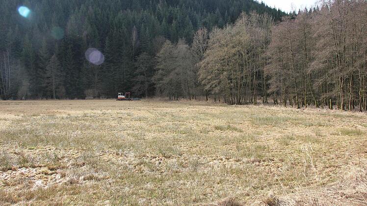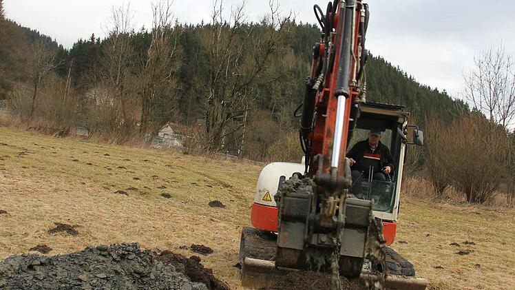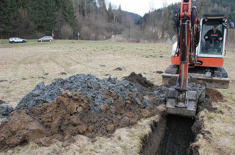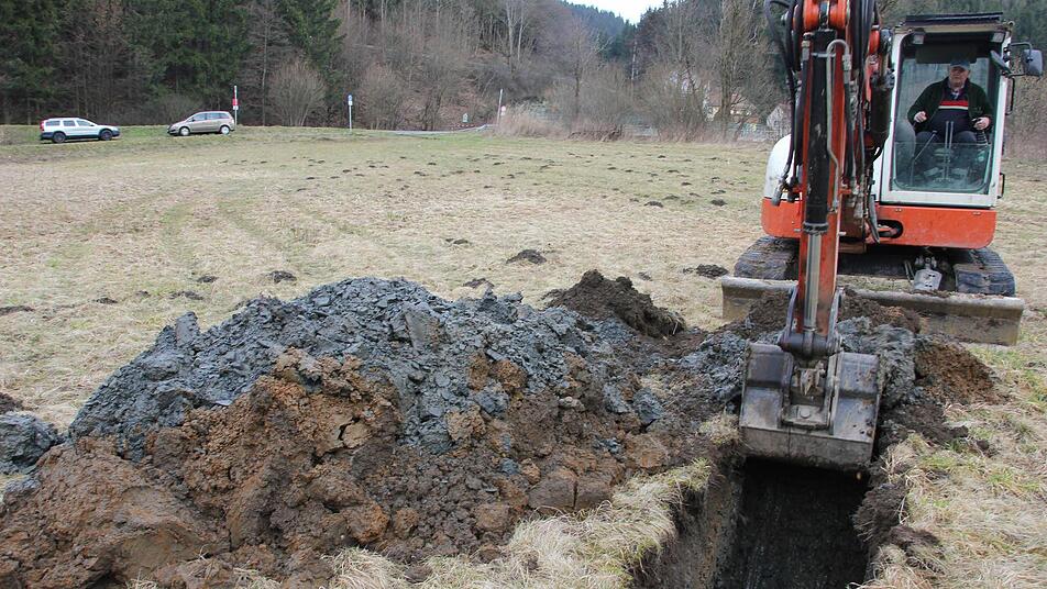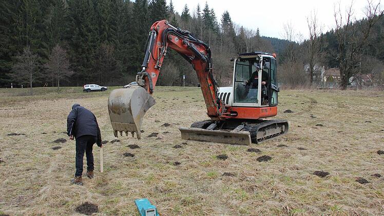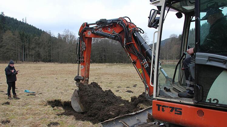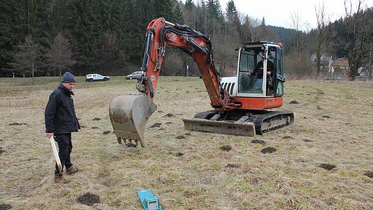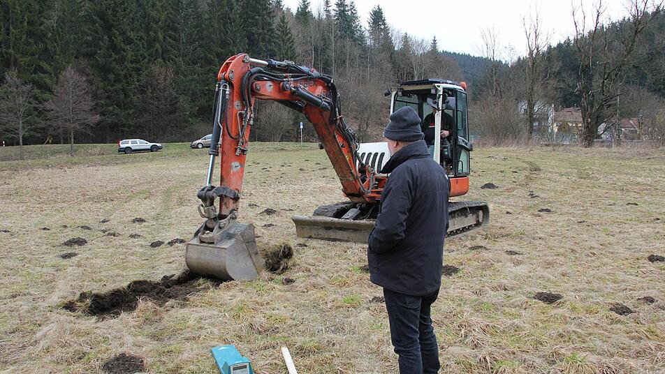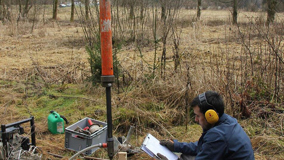 Am Montag begannen bereits die Baugrunduntersuchungen durch drei Mitarbeiter des Ingenieurbüros Piewak aus Bayreuth. Die sind auf hydrogeologische Arbeiten spezialisiert. Thomas Röckel setzt dabei auf drei Faktoren, um beurteilen zu können, ob sich das drei Hektar große Gelände für ein Staubecken eignet: Er lässt mit dem Bagger Probelöcher ausheben, um zu sehen, wie die Bodenschichten verlaufen. Bei Rammsondierungen werden dünne Stahlstäbe in den Boden getrieben, um festzustellen, wie der Widerstand ist. Mit Rammkernsondierungen treibt man einen Bohrpfahl in den Boden, um Proben entnehmen zu können.