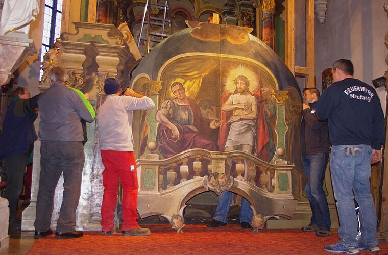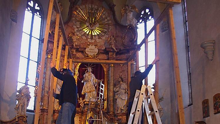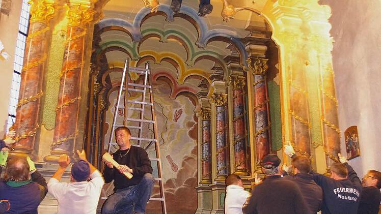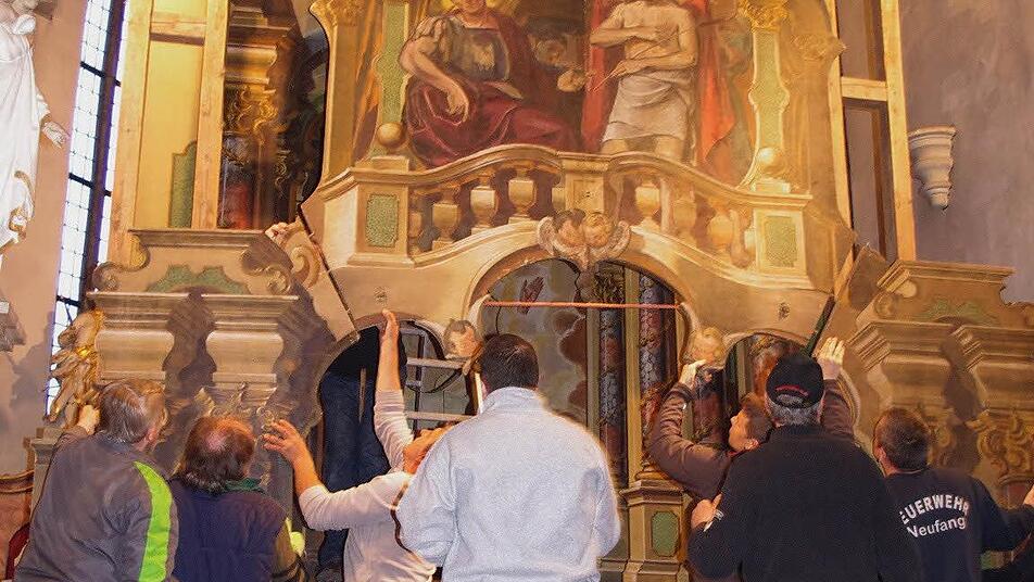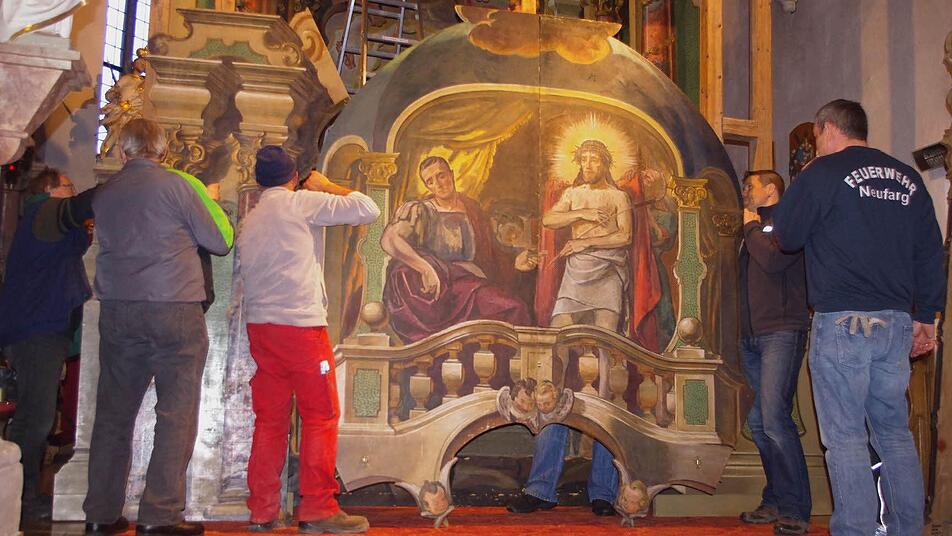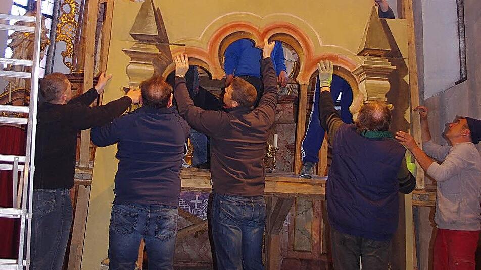 Es ist ein gewaltiger sakraler Aufbau - mit wunderbar gemalten Motiven, voller künstlerischer Qualität und mit einer gewaltigen Dimension: Mehr als zehn Freiwillige sind seit rund zwei Stunden damit beschäftigt, in der Pfarrkirche St. Laurentius Neufang die architektonische Nachempfindung und Nachbildung des Grabes Christi in der Grabeskirche von Jerusalem aufzubauen.