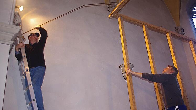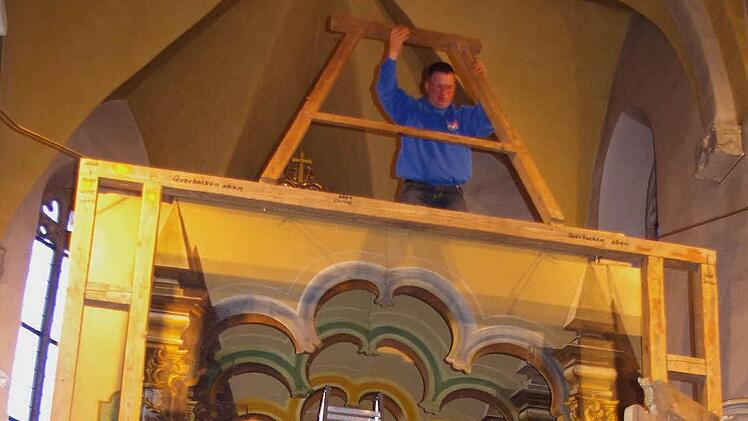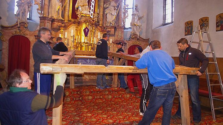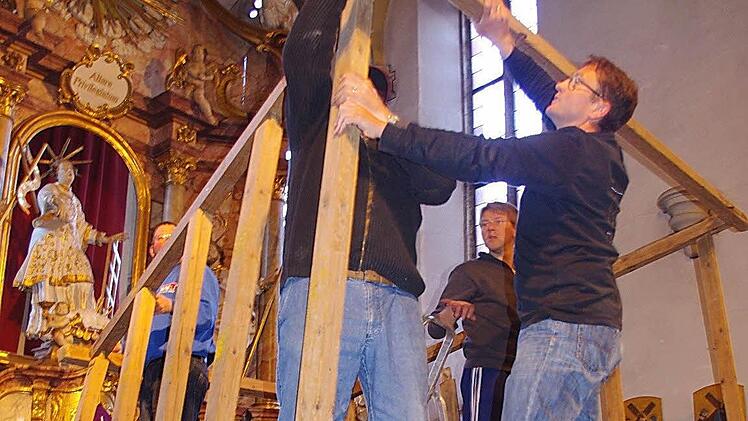 Die weitgehend beschrifteten und sortierten Einzelteile werden das Jahr über oberhalb der alten Sakristei gelagert. Nun warten sie - abgestellt im Gotteshaus - auf ihren "Einsatz". Die Männer bauen das Untergestell auf. Die Arbeit geht ihnen schnell von der Hand. Man merkt, dass sie Erfahrung darin haben und wissen, welches Bauteil wohin gehört. "Viele von ihnen sind Jahr für Jahr dabei. Es kommt halt darauf an, wie es zeitlich oder beruflich hinhaut. Aber diejenigen, die Zeit haben, kommen gerne", ist sich Kirchenpfleger Thomas Reißig sicher.