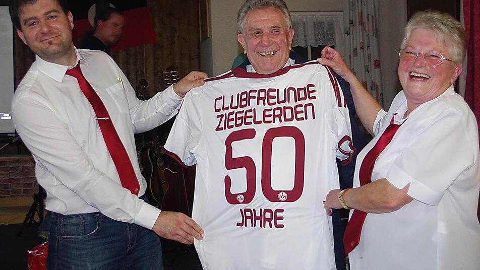 Ehrennadel des FCN Eine hohe Ehre wurde dem Jubilar seitens des 1. FC Nürnberg zuteil. So wurde er vom Fanbeauftragten Jürgen Bergmann für seine ein halbes Jahrhundert währende Mitgliedschaft und seine großen Verdienste für die Clubfreunde Ziegelerden mit der Ehrennadel in Gold ausgezeichnet.