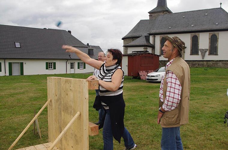 Zielsicher nimmt Robert Deuerling die blaue "Handgranate" in die Hände. Konzentriert visiert er sein Ziel an. Dann der Wurf: Er holt mächtig aus. Sein Wurf landet innerhalb des mehreren Meter entfernten Zielkreises. Nach seinen vier Würfen erhält er zehn Punkte und lässt damit den beiden Frauen im Team der KSK Birnbaum I, seiner Ehefrau Hildegund und Tochter Kathrin, den Vortritt. Die beiden Damen hatten wohl mehr "Zielwasser getrunken", konnten sie doch - im Gegensatz zu ihm - alle ihre Versuche platzieren, wofür sie jeweils 15 Punkte einheimsten. Mit weiteren 40 Punkten "im Gepäck" geht es für das Team zur nächsten Station, dem Schießen.