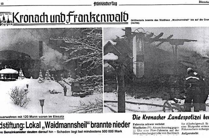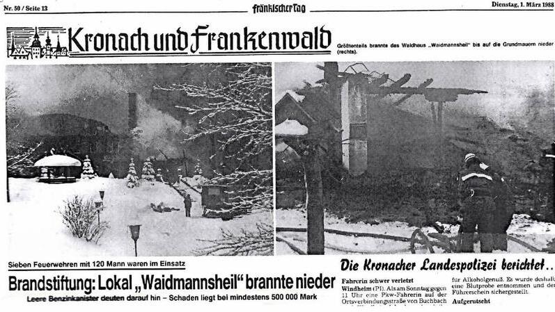 Den älteren Mitgliedern des Rennsteigvereins blieb der 29. Februar 1988 sicherlich in schmerzlicher Erinnerung. An jenem Tag kam es zu einem Großfeuer im Lokal "Waidmannsheil" in Ludwigsstadt. Das beliebte Waldhaus brannte zum Großteil bis auf die Grundmauern nieder. Umso überraschender für die Ludwigstädter war die Erklärung der Kriminalpolizei, die Brandstiftung als Ursache festgestellt hatte. Der Schaden lag bei rund 500 000 Mark. Personen kamen bei dem Brand nicht zu Schaden.