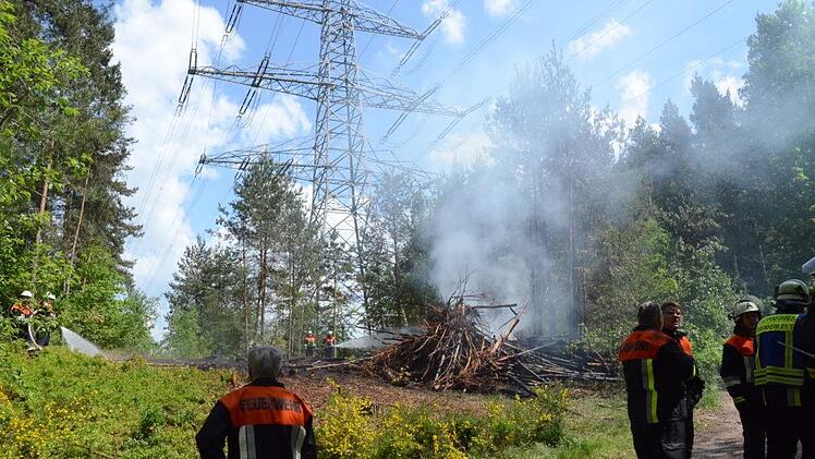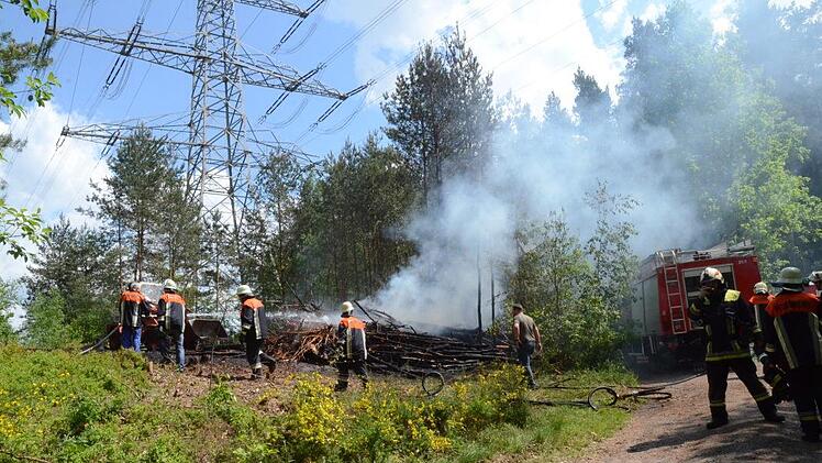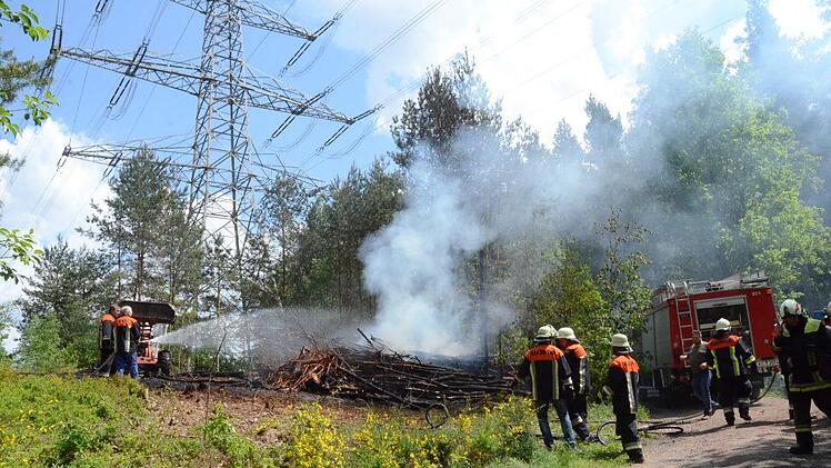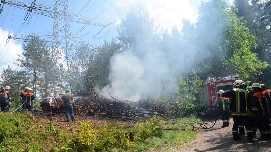Bilder vom Brand eines Holzstapels auf einer Wiese in Waldnähe von Haig.