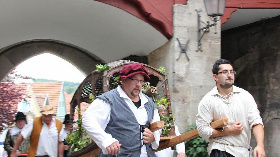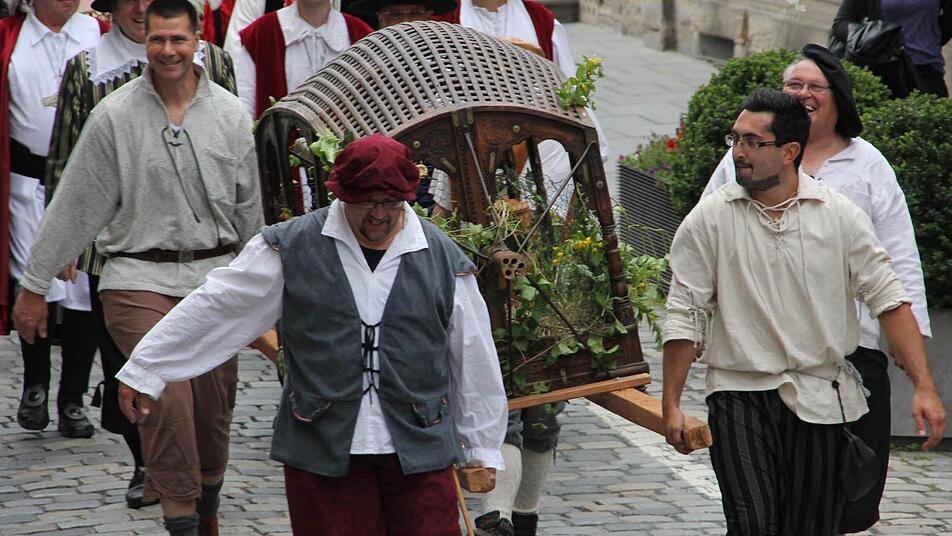 Ein Hase auf der Sänfte Vom Kaulanger marschierten die historischen Gruppen in Richtung Brauerei Kaiserhof. Auf einer Sänfte getragen war Housnkuh "Lulu" dabei ein Blickfang. Auf den Aufruf des Tourismusbetriebs der Stadt in unserer Zeitung hin, hatten sich schnell Träger für das sagenumwobene Kronacher Tier gefunden.