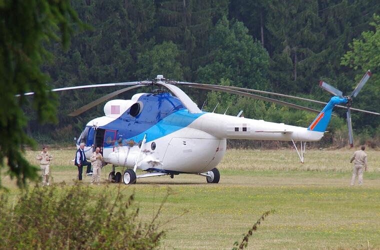 Nach wenigen Minuten setzte die Maschine zur Landung auf dem Segelflugplatz am Kreuzberg an. Zufälligerweise war einer unserer Reporter in der Nähe und fuhr zum Hubschrauber. Mehrere Insassen verließen die Maschine. Einer kam gleich scherzend auf unseren Berichterstatter zu: "Wir sind nicht die Russen!" Wie der Mann erklärte, handelte es sich um einen Personentransport von Köln nach Prag.