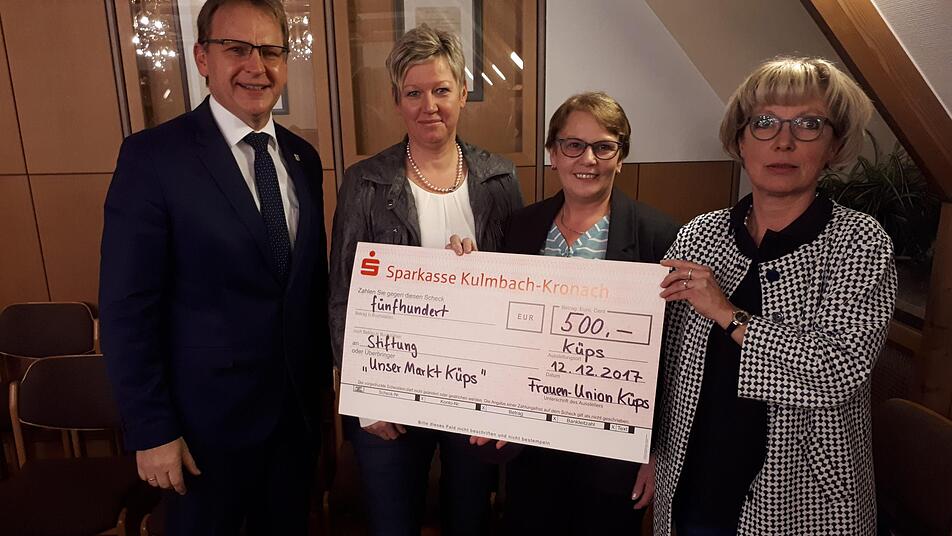 Weiter begrüßte Bernd Rebhan die Einrichtung einer Bürgerstiftung in seiner Gemeinde. Zum Grundstock gab es zu der "Stiftung unser Markt Küps" von der Sparkasse 5000 Euro. Der Bürgermeister freute sich, dass nun binnen weniger Wochen dieser Betrag auf rund 15 500 Euro angehoben wurde. Diese 10 500 Euro kamen durch Spenden zusammen. Der Bürgermeister bedankte sich in diesem Zusammenhang bei allen Spendern, insbesondere beim Büro Herbert Müller, Hans Rebhan, Thorsten Schönsee, David Hall, der Raiffeisen-Volksbank Küps und der Frauen-Union Küps, die bei der Jahresabschlusssitzung am Dienstagabend einen Scheck in Höhe von 500 Euro überreichten.