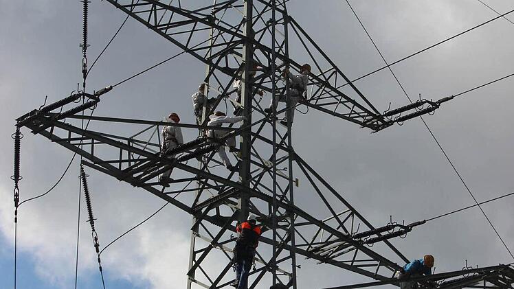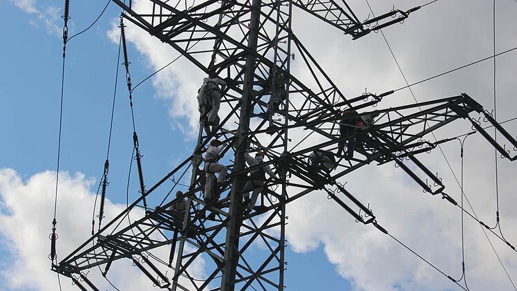 Industriekletterer säubern Hochspannungsmasten zwischen Friesen und Stockheim und sorgen für einen neuen Anstrich. Der Strom ist abgeschaltet und die Männer sind gegen Absturz gesichert.