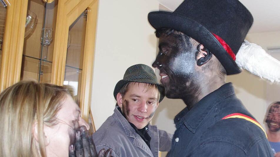 Dem Zug nähert sich ein Auto. "Halt", ruft es wie aus einem Mund. Gemeinsam verstellen die Burschen der Frau die Fahrbahn. Sich ihrer ausweglosen Lage bewusst, lässt die nette Dame ihre Autoscheibe herunter - wohl wissend, was gleich auf sie zukommt. Schlotfeger Kai Oliver zögert keine Sekunde, sondern reibt sich - im wahrsten Sinne des Wortes - schon einmal die Hände - und zwar mit schwarzer Farbe. Er beugt sich ins Auto und streicht genüsslich mit beiden Händen Brunhilde Kotschenreuther über die Wangen.