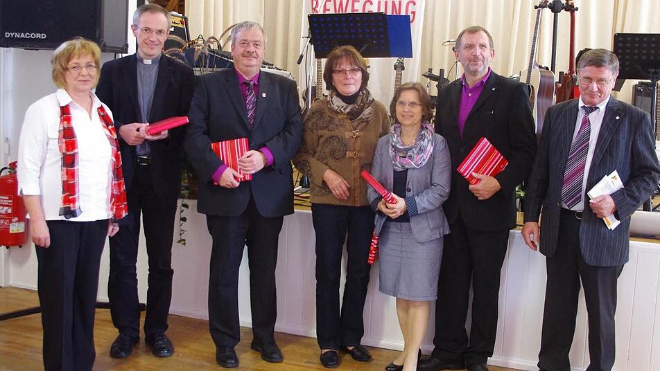 Band der Mitglieder spielt auf Abschließend bedenkt Dietrich aus Dankbarkeit für die gewährte Unterstützung die Diözesanvorsitzende Ingrid Schumann, Eckhard Schneider, Ralph Korschinsky, Inge Eichels dörfer sowie Präses Michael Dotzauer mit einem Geschenk. Für die musikalische Umrahmung sorgen an diesem Tag "Mash", eine Band, die nur aus KAB-Mitgliedern besteht, sowie der Männerchor Cäcilia und die Frauenschola Wilhelmsthal.