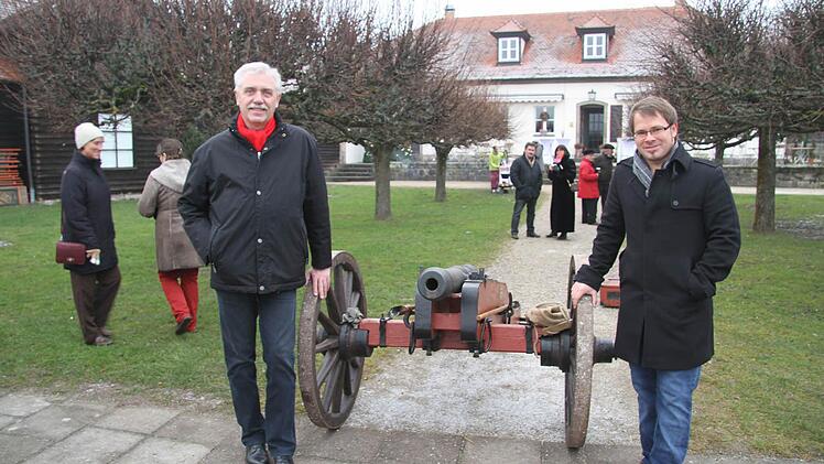 Kronachs Bürgermeister Wolfgang Beiergrößlein (FW) bekam im neuen Jahr eine Ausnahme. Ja, er durfte beim Reinigen der Geschütze mit Hand anlegen. Aber der Hauptmann und Kommandant der Kronacher Bürgerwehr, Karl-Peter Wittig und Kanonier Jörg Werthmann, hatten ein strenges Auge darauf, ob der Bürgermeister auch alles richtig machen würde. Denn Akribie und Genauigkeit sind wichtig. Nur, wenn die Rohre der mächtigen Geschütze sauber sind, funktionieren sie auch reibungslos. "Das ist ja gar nicht so einfach", staunte dann Beiergrößlein nach einigen beherzten Kehr-Stößen - und überließ Werthmann schnell wieder die Utensilien, die der grauen Vergangenheit nachempfunden sind. Unterdessen füllten die Kanoniere der Bürgerwehr ihr Pulver in die Rohre. Das Pulver wurde zusammengepresst.