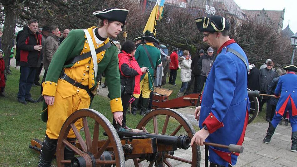 Und erst, als alle drei Kanonen - übrigens drei Geschütze in sehr unterschiedlicher Größe - fertig vorbereitet waren, waltete Kommandant Karl-Peter Wittig seines Amtes. Er hob den Stab. Und die drei Kanonen wurden nacheinander gezündet - von links nach rechts, so wie es der Oberbefehlshaber angeordnet hatte.