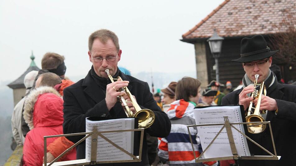 Lautstark begrüßte die Kronacher Bürgerwehr mit ihren Geschützen das neue Jahr 2014 auf der Kronacher Festung Rosenberg. Zum ersten Mal hatten die St.Georgs-Bläser ihr Neujahrskonzert auf den Nachmittag verlegt und sorgten bei der Begrüßung für die musikalische Ausgestaltung.