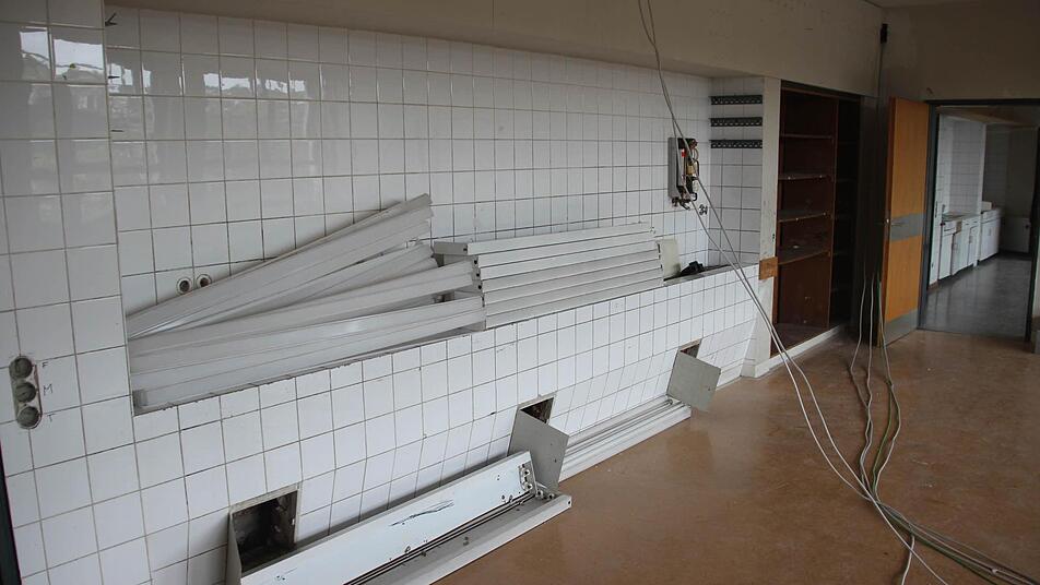 Alles muss raus Dann führt der Rundgang in den Hauptbau, in bereits ausgeräumte Zimmer. Da kommen nicht nur die Schulmöbel raus, auch die Haustechnik: die alten Heizkörper, die Beleuchtung etc. Günther Daum zeigt an ein paar bereits geöffneten Stellen, warum die Gipskartonplatten von den Decken entfernt werden: Da neueste Bauvorschriften im Brandfall bestimmte Betonstärken vorsehen, damit das Eisen im Stahlbeton, das für die Tragfähigkeit verantwortlich ist, nicht so schnell schmilzt, muss zusätzlicher Beton aufgespritzt werden.