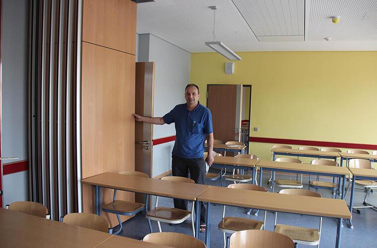 Beamer und Whiteboards Die Neue Werkbühne im Mittelbau wird während der Bauarbeiten zum Musikzimmer umfunktioniert. Günther Daum ist sich sicher, dass der Werkraum bis zum ersten Schultag fertig wird. Besser sieht es da schon in den Klassenzimmern aus. Die sind so gut wie komplett ausgestattet.