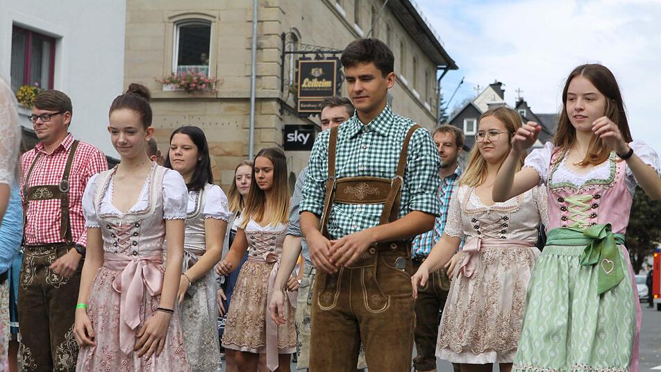 Nach der Ausstellungseröffnung am Mittwoch im Künstlerhaus (wir berichteten) zog man bereits am Donnerstag bei Regen unter den Klängen des örtlichen Spielmannszugs vom Kriegerdenkmal zum Dreschhallenplatz, wo der Auftakt stattfand.