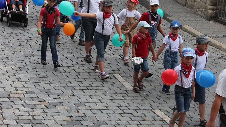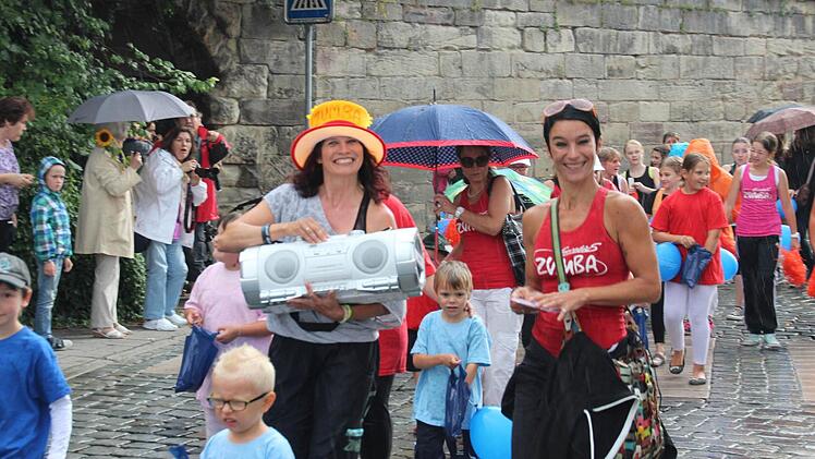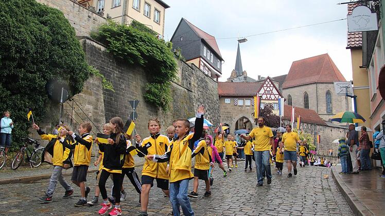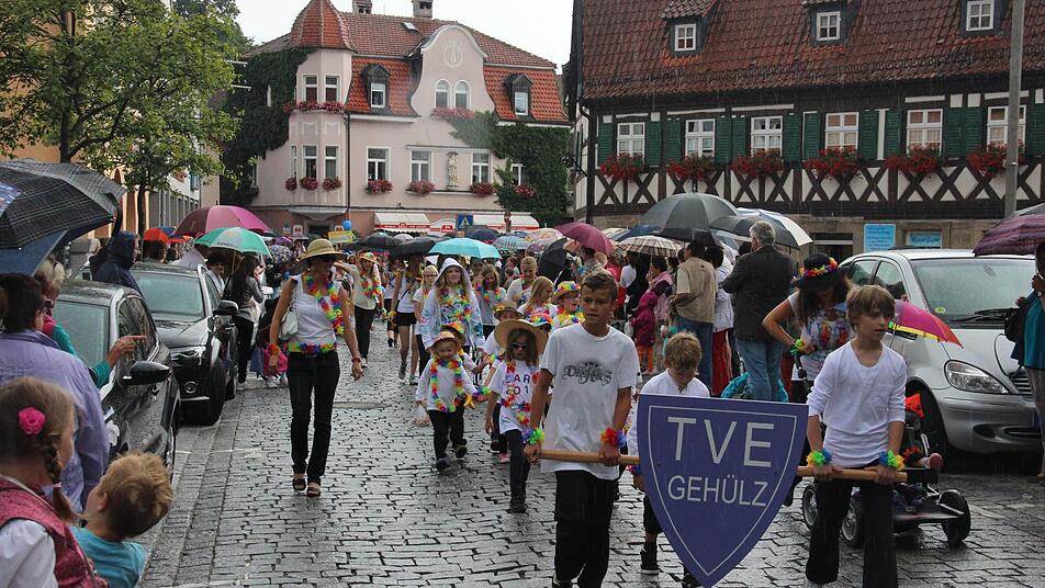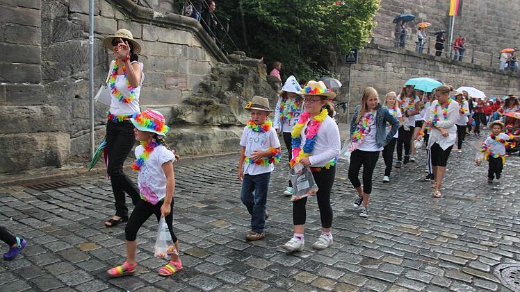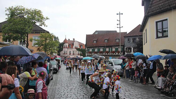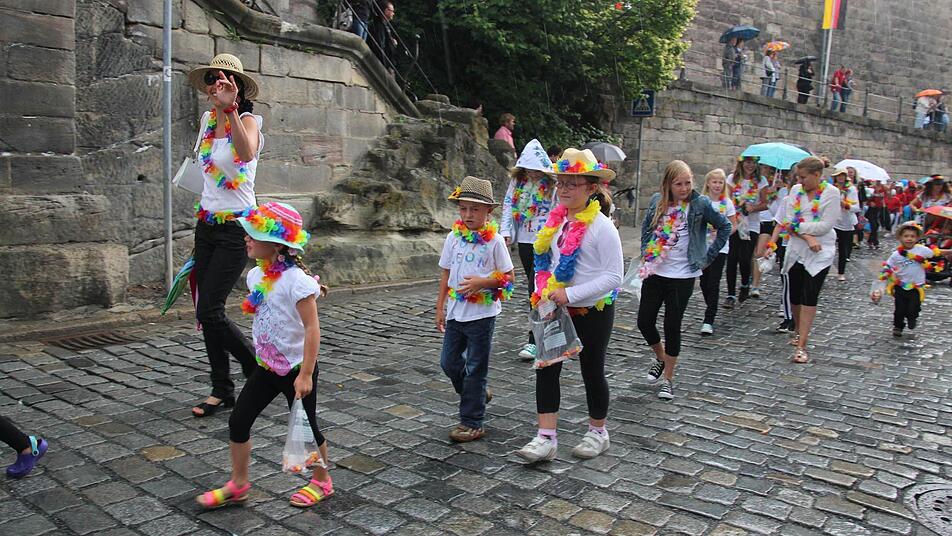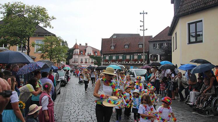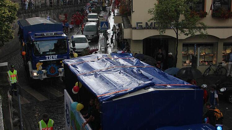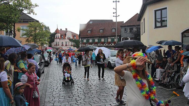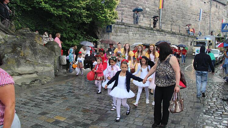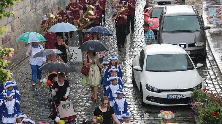 Ausgerechnet während des Kinderfestzugs ging am Dienstag in Kronach ein Regenschauer nieder, sodass fast sämtliche Teilnehmer und Zuschauer des Festzugs durchnässt wurden.