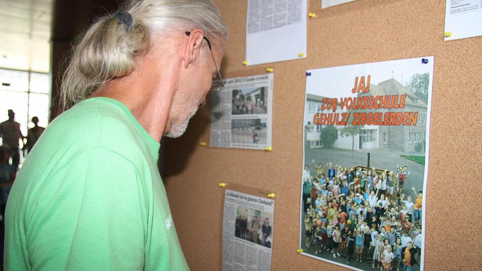 Staunend und mit einem gewissen Bedauern blickt Bürgermeister Wolfgang Beiergrößlein (FW) auf die Ausstellungswand, auf der Bilder von einst zu sehen sind. Auch die Protestaktionen, die sich gegen die Schließung der Gehülzer Schule wandten, sind noch einmal offengelegt.
