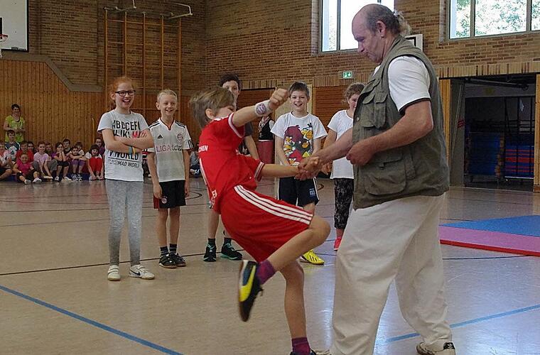 Sie zeigten beispielsweise den richtigen Einsatz von Körpersprache und Stimme, verschiedene Techniken zur Selbstverteidigung und das richtige Verhalten, wenn man im Schulhof in die Enge gedrängt oder aus einem Auto heraus angesprochen werde. "Eure stärkste Waffe ist die Stimme", appellierte Busse. Die "Vollpfosten" - so seine Bezeichnung für Straftäter - suchten sich in der Regel schwächere Kinder aus.