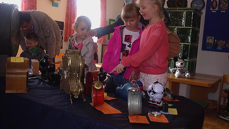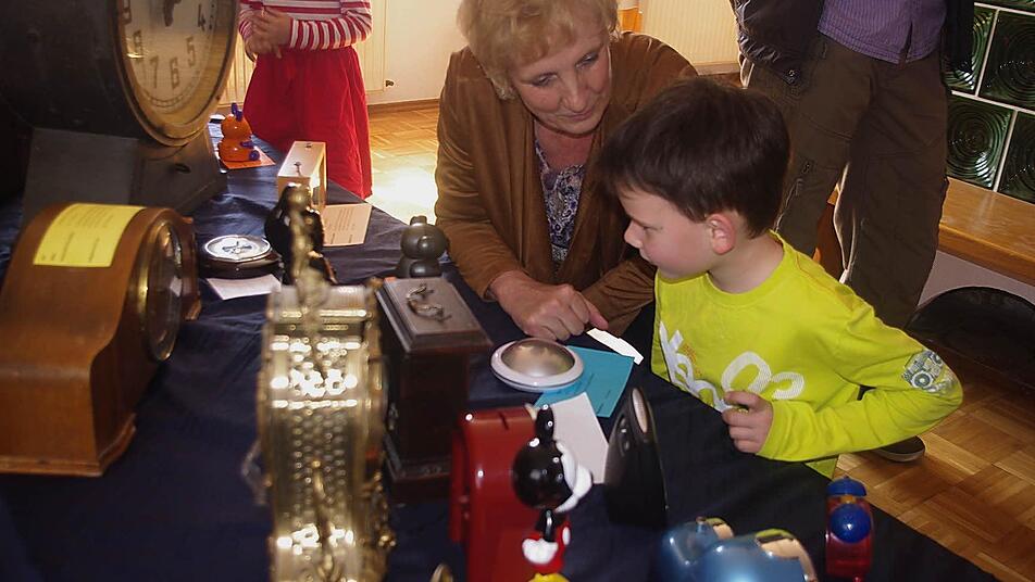 Die Uhr mit den schwarzen Tauben war nur eines von vielen Exponaten des Uhrenmuseums im Pfarrhauswohnzimmer. Und was gab es da nicht alles zu sehen: richtig alte "Schmuckstücke", darunter beispielsweise eine große Bahnhofsuhr, eine Schachuhr, eine Stoppuhr, eine Schrankuhr mit Schlüssel zum Aufziehen sowie mehrere Wetterhäuschen, bis hin zu ganz modernen Uhren wie einem Mickey-Mouse-Wecker.