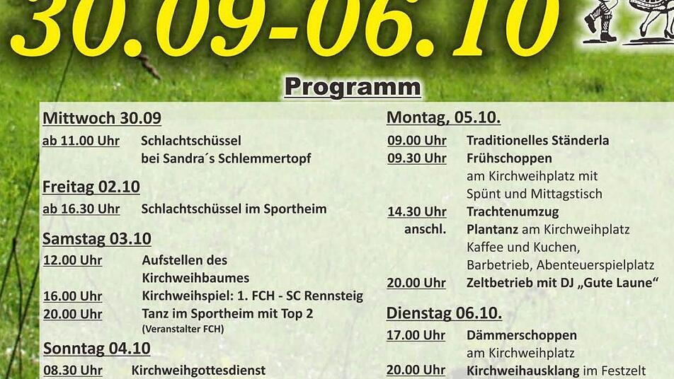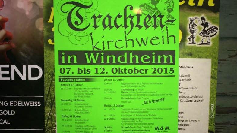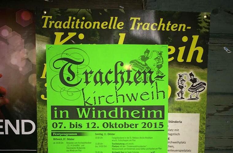 Da staunten die Verantwortlichen der Trachtenkirchweih, die am kommenden Wochenende in Hirschfeld stattfindet, nicht schlecht: Kurze Zeit, nachdem sie Plakate mit dem Festprogramm für ihre Kirchweih aufgehängt hatten, waren diese überklebt - mit den Plakaten für die ein Wochenende später stattfindende Trachtenkirchweih im Nachbarort Windheim. Die drübergeklebten Plakate verdeckten das gesamte Festprogramm der Hirschfelder.