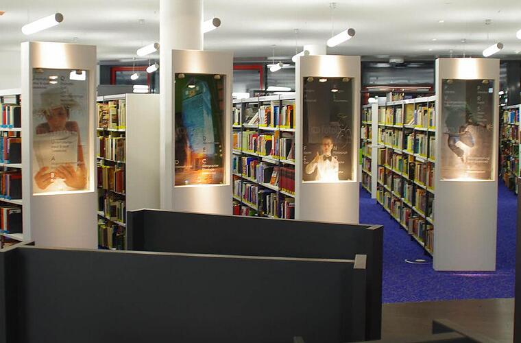 Platz für Recherchen Nach dem Eingang stößt der Besucher zunächst auf Rechercheplätze und Zeitschriften sowie auf die so genannten AV-Medien oder Non-Books - sprich: DVD, CD, Hörbücher etc. Dahinter reiht sich der Kinderbereich ein, der bereits deutlich macht, was das Ziel der Umgestaltung war. Ein farbenfroher Lesebereich, eine geräumige und zugleich heimelige Ecke mit einem Spielboot zum "Abtauchen" sowie Lese-Nischen laden schon die Jüngsten zum Schmökern ein. Dabei sind die Regale so gestaltet, dass immer ein Einblick möglich ist, der Nachwuchs sich gleichzeitig aber nie überwacht fühlt.