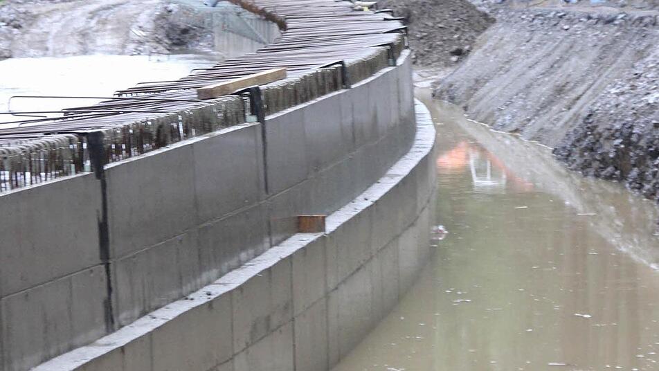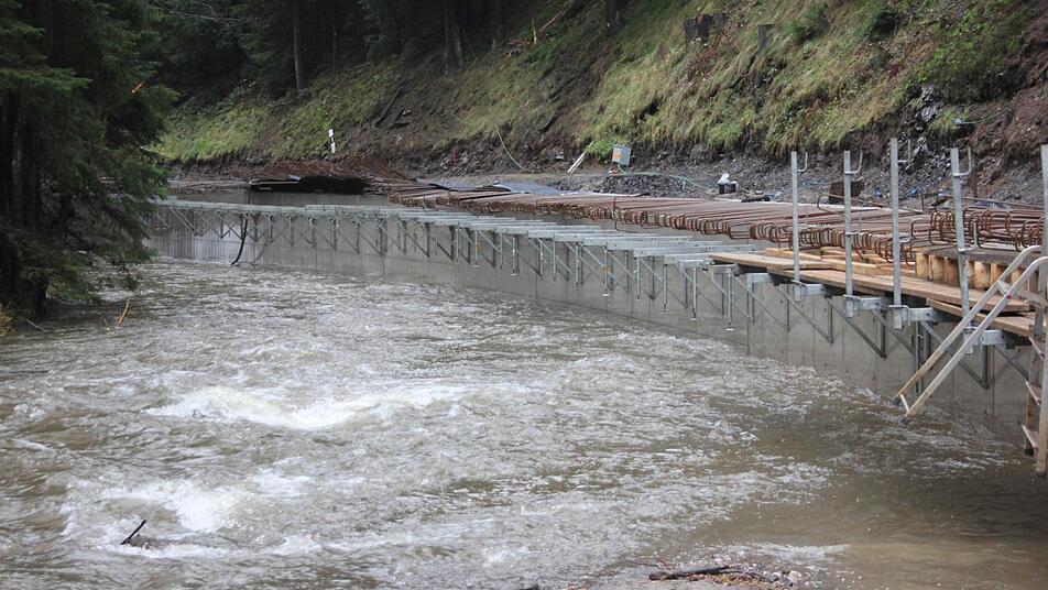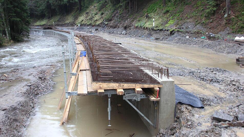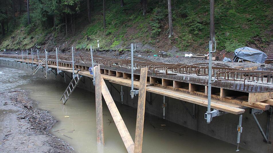 Beim Betonieren der Stützmauer kam den Straßenbauern die Trockenheit zugute. Der Kremnitzfluss wurde in einem Bypass an der ehemaligen Kugelmühle vorbeigeleitet, dazu der alte Mühlgraben genutzt. So konnte man "trockenen Fußes" die Stützmauer gründen. Als die fertig war, kam das Hochwasser, das an der neuen Stützmauer vorbeischoss. Jetzt ist der Wasserstand wieder normal, der Bypass funktioniert wieder und die Bauarbeiter arbeiten am ausgekragten Gehsteig der Stützmauer. Ein Teil der neuen Strecke ist schon asphaltiert, bei der Stützmauer wird Schotter eingefüllt.