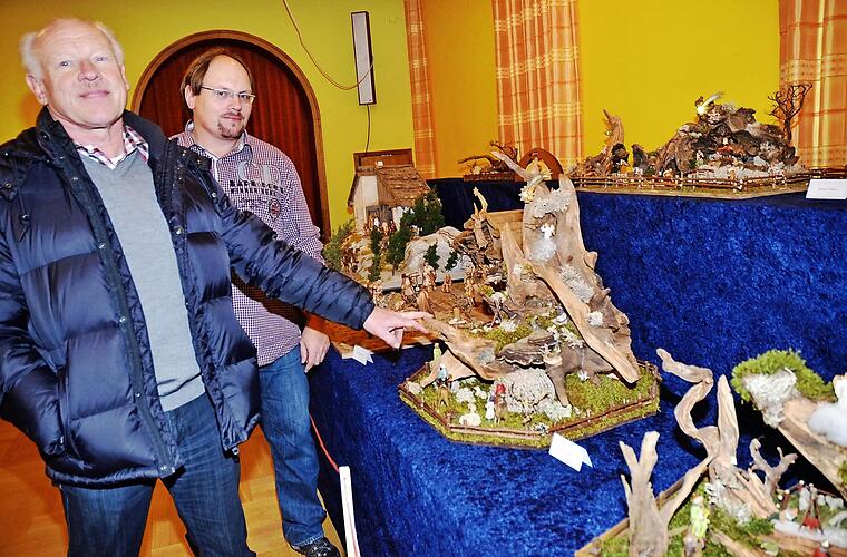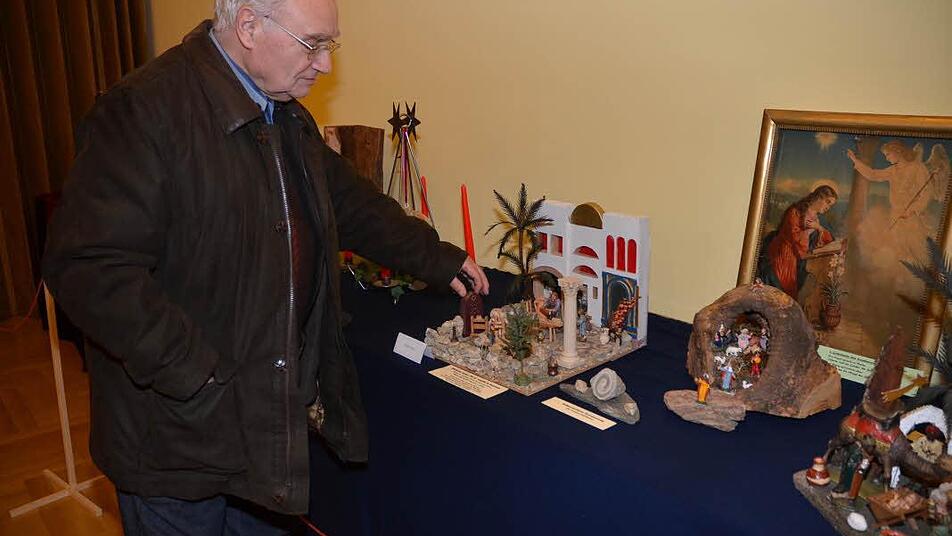 Erfreulich war für die Veranstalter der Herz-Jesu-Pfarrei auch, dass es neben schönen geschnitzten Weihnachtskrippen mit liebevoll kreierten Landschaften und bemalten Figuren auch einige Unikate gab. Heinrich Grebner stellte sogar eine Krippe mit Figuren und Landschaft aus Kronacher Sandstein aus. Ein anderes Unikat stellt der Ortschronist Georg Dinkel aus. Seine Krippe zeigt die heilige Familie im Hause in Nazareth.