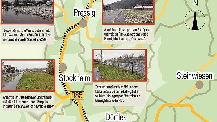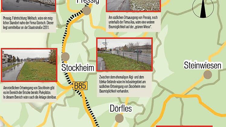 Stockheim: Edmund Sprenger (SPD), der zurzeit Bürgermeister Rainer Detsch (FW) vertritt, ging auf zwei mögliche Grundstücke für die Anlage ein - im Indus triegebiet bei der Edeka sowie im Norden von Stockheim bei der Brücke an der Eisenbahnstrecke. Durch die Berichterstattung in der Zeitung sei Rainer Detsch auf die Möglichkeit aufmerksam geworden, für Stockheim noch den Hut in den Ring zu werfen. "Und es ist ja legitim, dass sich andere Gemeinden auch bewerben." Dabei spreche für Stockheim vor allem die zentrale Lage.