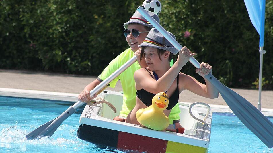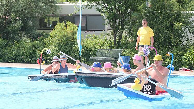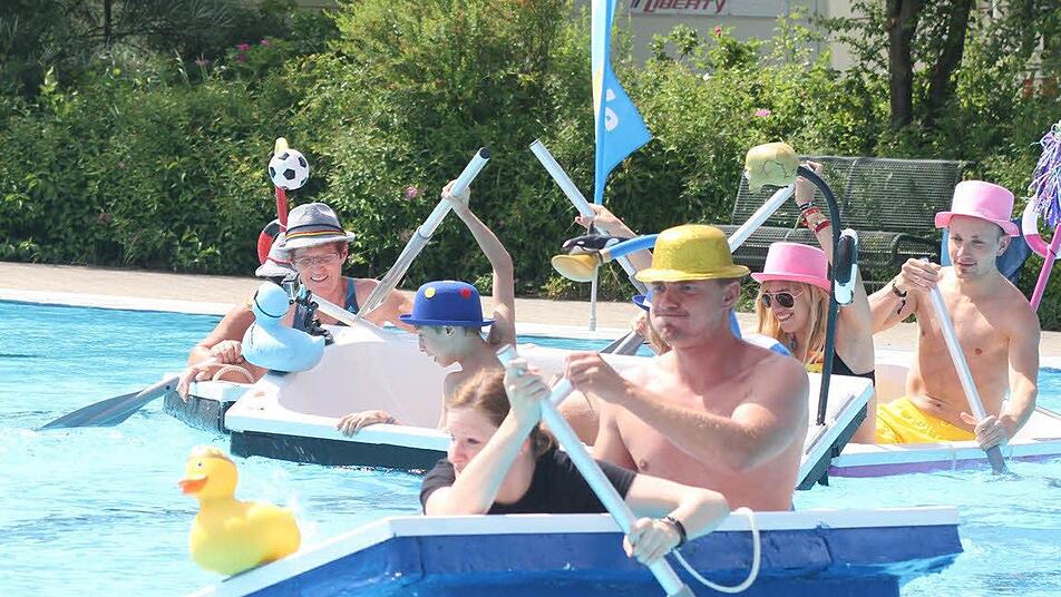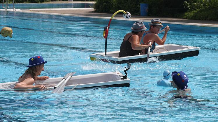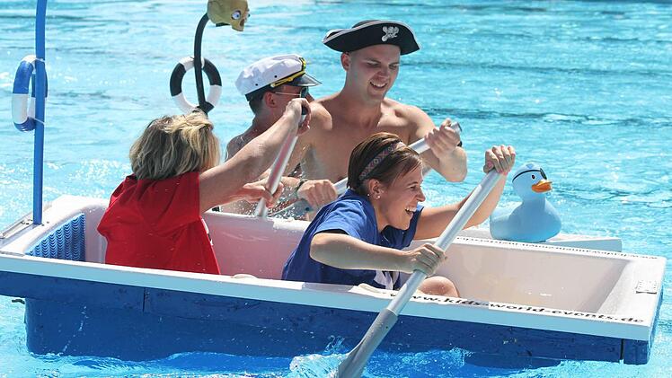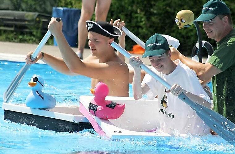 Die Regeln für das erste Badewannenrennen waren einfach. Als Rainer Braun das Kommando gegeben hatte, paddelten die vier Badewannen los, umrundeten in der Mitte des Beckens die Entenbojen - und kamen dann möglichst schnell wieder zurück. Kein Hexenwerk, mag mancher denken, denn die Entenbojen waren nach 25 Metern gesetzt. Die Strecke war also machbar.