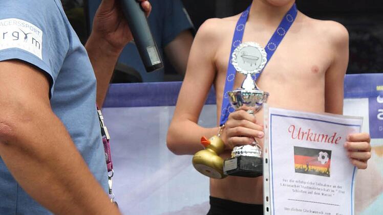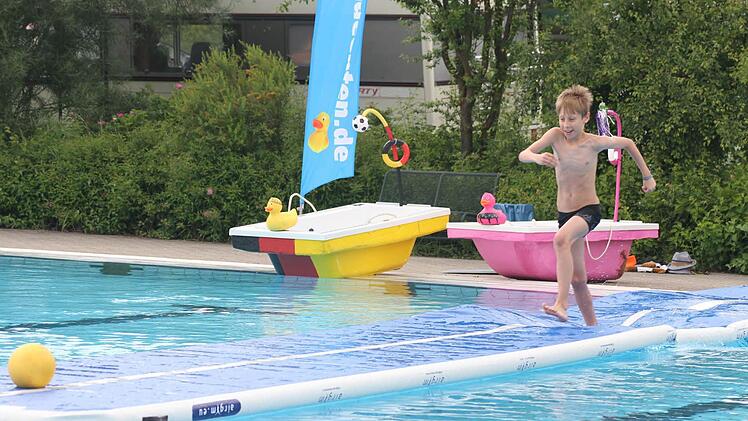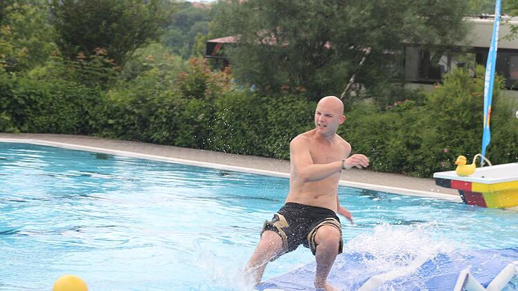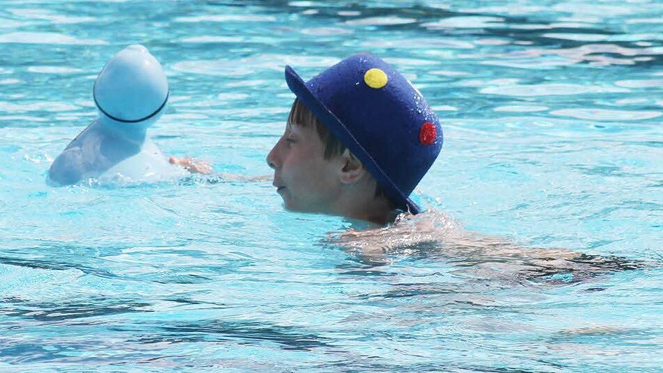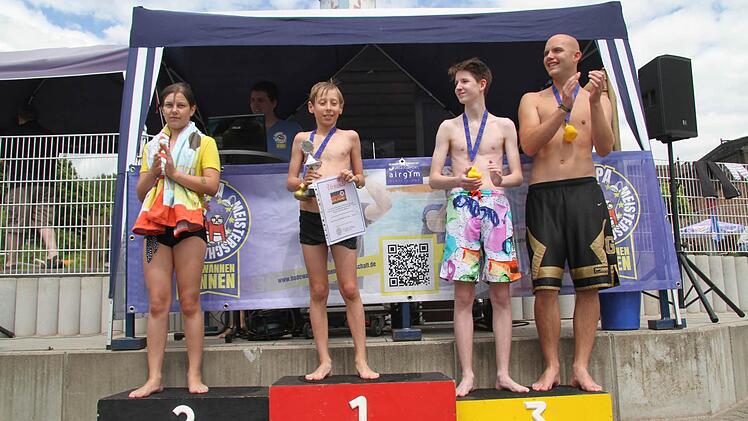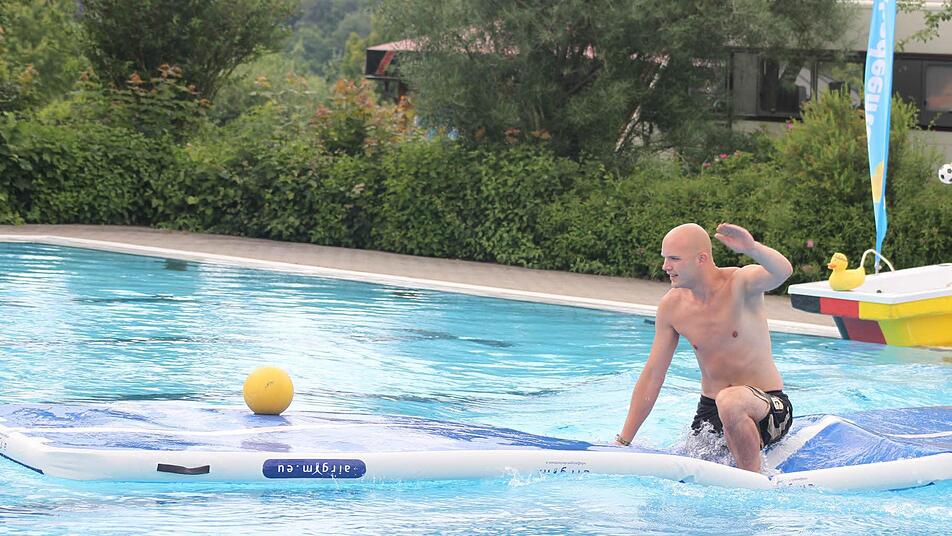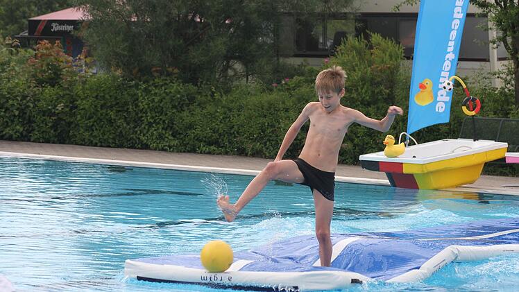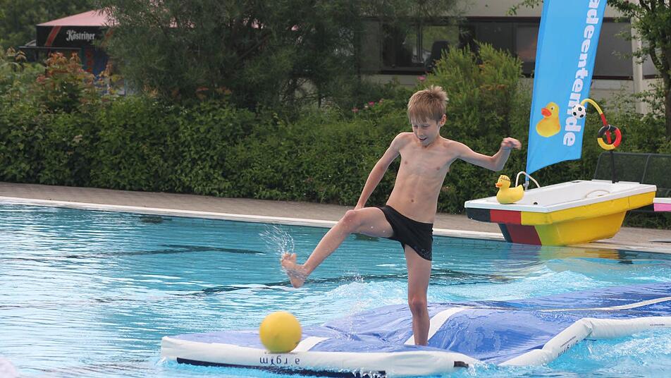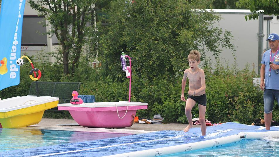 Aber nicht nur in der Badewanne hatten die passionierten Freibadgänger Spaß, sondern auch beim Elfmeterschießen im Wasser. Und das erwies sich als tückisch: Denn die Schützen mussten elf Meter auf einem aufblasbaren Steg auf dem Wasser zurücklegen - und der war so gar nicht stabil. Sieger beim Elfmeterschießen war Justin Moshacke, zehn Jahre alt. Er konnte den Pokal und das goldene Quietsche-Entchen mit nach Hause nehmen und verwies Anna Maria Pfromm und Sebastian Flesch und André Herd auf Rang zwei und auf die beiden dritten Plätze.