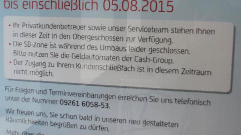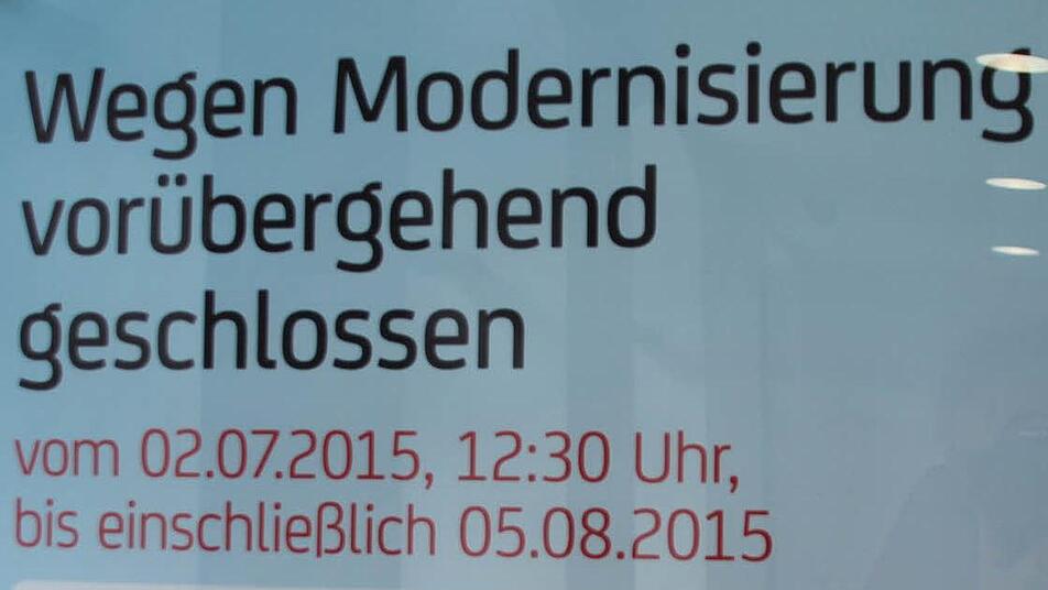 Die Kunden waren beim ersten Blick auf die Schilder ein bisschen irritiert, weil sie den Hinweis auf die Umbauarbeiten in Schalterraum und Selbstbedienungszone der HypoVereinsbank-Filiale in Kronach nicht zu Ende gelesen hatten: "Wegen Modernisierung vorübergehend geschlossen", lautete die Überschrift. Fünf Wochen lang, vom 2. Juli bis 5. August, wird das Erdgeschoss des denkmalgeschützten Gebäudes komplett umgebaut.