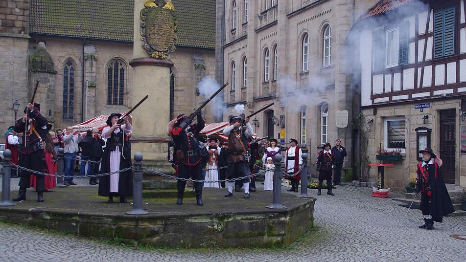 Stadthauptmann Walter Schinzel-Lang hatte der Cronacher Ausschuss Compagnie das Kommando erteilt, den Bauernmarkt mit Salutschüssen aus den Musketen zu eröffnen. Wie er ausführte, unterstütze man sehr gerne das Engagement der Fieranten.