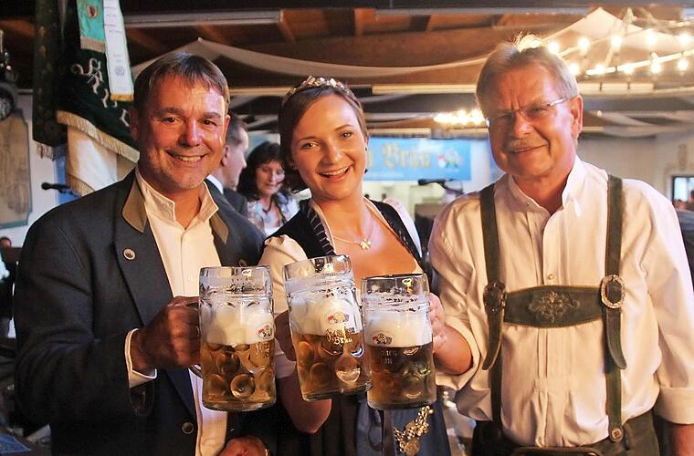 Drei Brauereien Der Bieranstich, bei dem zwischen den drei Brauereien gewechselt wird, fand heuer im Schützen-Stadl bei der Frankenbräu statt. Brauerei-Chefin Elisabeth Bauer freute sich, dass trotz des nicht gerade prickelnden Wetters so viele Besucher gekommen waren. Sie hieß die Besucher auch im Namen der Familien Höfner (Gampertbräu) und Kaiser (Kaiserhofbräu) willkommen. "Eigentlich ist es erstaunlich, dass wir hier sein dürfen, war doch das Fest infrage gestellt", sprach auch sie die Turbulenzen der vergangenen Tage an. "Unser Bier ist spitzenmäßig. Das haben wir unserem Braumeister zu verdanken", lobte sie den edlen Gerstensaft. Elisabeth Bauer rief alle Gäste auf, das Freischießen mit seiner besonderen Atmosphäre zu erleben.