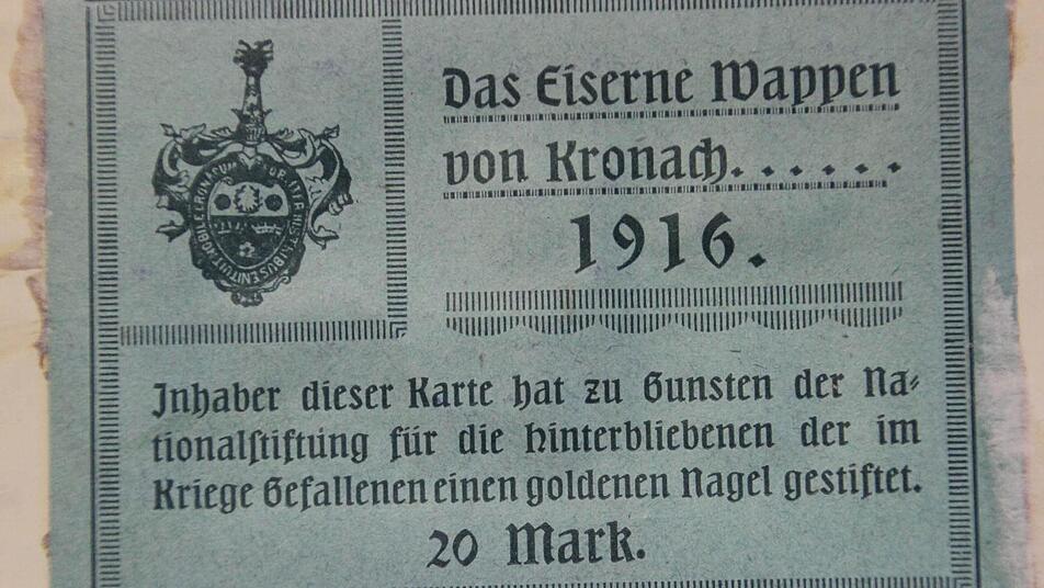 Alleine schon durch seine Entstehungsgeschichte infolge des Dreißigjährigen Krieges ist das Kronacher Stadtwappen etwas Besonderes. Fast 300 Jahre später stand es wieder im Zuge eines Krieges im Blickpunkt. Mit eisernen, silbernen und goldenen Nägeln wurde es von den Kronachern nachgebildet. Jeder dieser Nägel sollte die Not der Kriegsinvaliden und der Hinterbliebenen lindern.