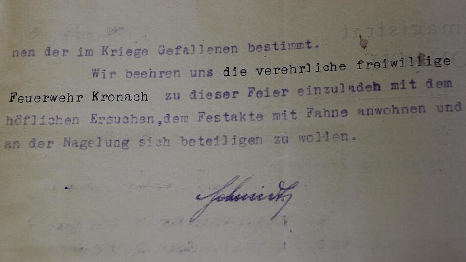 Wich erzähltNeben der Nagelung berichtet Hermann Wich noch weiter aus dem Nähkästchen eines ehemaligen Stadtarchi vars über den Ersten Weltkrieg in Kronach. Nikolaus Schmidt war seinen Worten von 1912 bis 1933 das Kronacher Stadtoberhaupt. Schmidt leitete auch die Nagelungsfeier bei einem riesigen Menschenandrang vor dem Rosenturm. Die Nazis haben den Kommunalpolitiker letztlich ohne Pensionsansprüche geschasst.