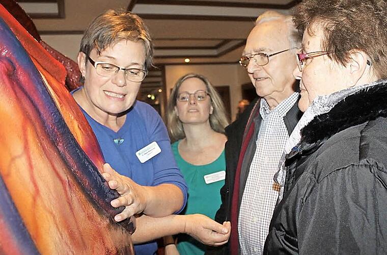 Fast immer standen Besucher an diesem Herz-Modell. Es wurden Fragen geäußert, wie beispielsweise wie funktioniert das Herz, was passiert bei einem Herzinfarkt? Erkennen konnten die Interessierten unter anderem den Vorhof, die Segelklappe. Es wurde verdeutlicht, wie dieser Hohlmuskel den Blutkreislauf in Gang hält. Außerdem wurde der Einsatz medizinischer Implantate wie Stents dargestellt.