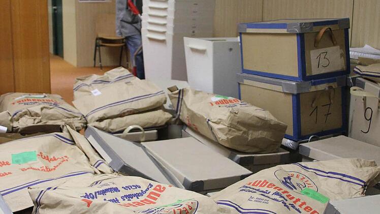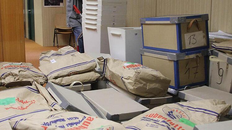 Bernd Schmidt hat einen Berg von Arbeit vor sich. Zentnerweise schleppt oder fährt er Papiersäcke, auf denen "Taubenfutter" steht, vom 1. Stock des Kronacher Rathauses in den Keller. Die Stadt Kronach ist jedoch nicht umgeschwenkt und zur taubenfreundlichen Stadt geworden, nein, in den Säcken mit der irreführenden Aufschrift verbergen sich die Stimmzettel der Wahl vom Sonntag. Dass es sich um Wahlunterlagen handelt, darauf deuten zwei weiße Klebesiegel und ein grüner Aufkleber hin.