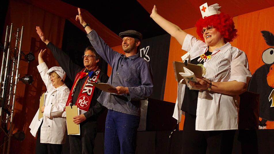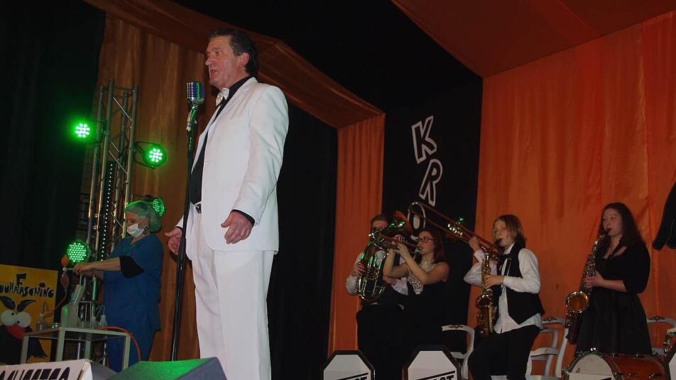 "Rettungsschwimmer" begeistern Auch die weiteren tänzerischen Show-Acts begeisterten - so Solo-Tanzmariechen Sofia Schülein als auch die Schwestern Leonie und Sevilay, die eine flotte Sohle aufs Parkett legten. Die "Baywatch Rettungsschwimmer von Malibu" wandelten auf den Spuren von David Hasselhoff. Die Jungs in ihren sexy Strandanzügen, knackig kurzen Boxershorts und weißen Feinripp-Unterhemden schwangen ihre Beine und ließen die Hüften kreisen, dass es eine wahre Freude war. Sie dürfen bei keinem Krouha-Fasching fehlen: "Die Glöckchen in Röckchen" sind von Anfang an dabei. Auch heuer waren die Sexbomben in ihren aufreizenden schwarz-roten Kostümen eine einzige Augenweide. Natürlich gab es auch wieder jede Menge Sketsche und Musikeinlagen. Musikalische Akzente setzten die hessische Raupe Andrea Gregor, die sich in einen schönen fränkischen Schmetterling verwandelte. Max Raabe - alias "Krouha-Mo" Hans-Peter Laschka - und sein Palastorchester gaben Lieder wie "Mein Gorilla hat 'ne Villa im Zoo", "Dein ist mein ganzes Herz" oder "Kein Schwein ruft mich an" zum Besten. Recht ungewöhnlich war das Liebeslied "Ja Schatz" von Uli Thron, die ihrem Liebsten sogar mit einer Axt nach dem Leben trachtete.