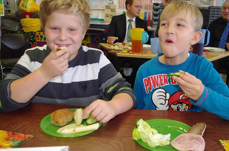 Jetzt aber haben die beiden Zehnjährigen keine Zeit mehr für weitere Auskünfte. Ihre Teller sind leer und Nachschub muss geholt werden. Gut, dass auf dem Büfett noch viele weitere, gesunde Leckereien nur darauf warten, von ihm und den anderen kleinen Feinschmeckern verputzt zu werden.