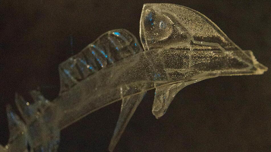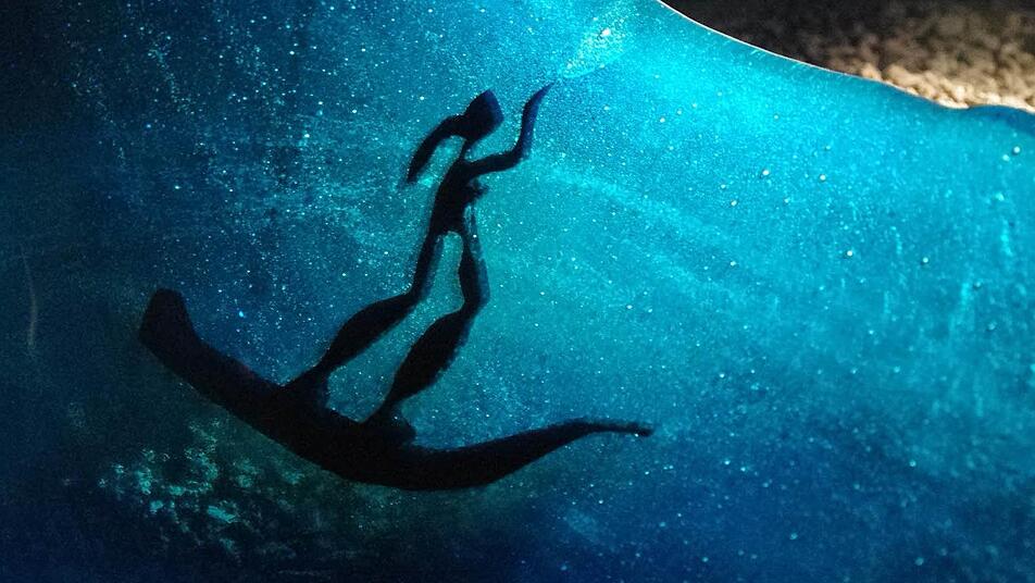 Geisterhafte Gestalten leuchten im Dunkel des Gangs. Glitzernde Fische schweben über kleine, gläserne Boote hinweg. An der Wand zeichnet sich ein bizarres Schattenspiel ab.