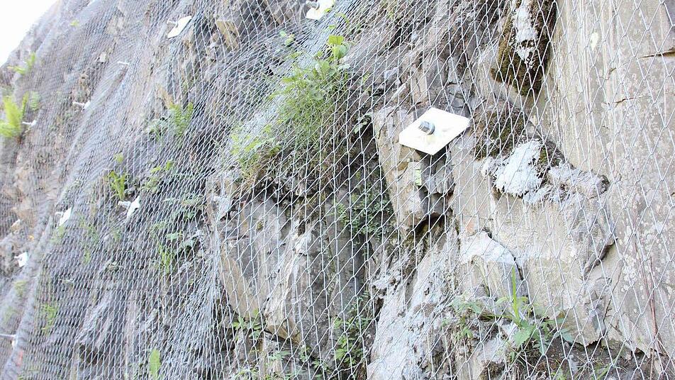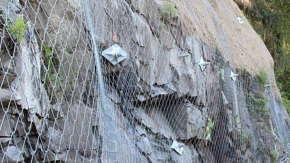 Auch die Felssicherung zwischen Kugel- und Felsmühle ist beendet. Drei bis fünf Meter lange Anker wurden in das Gestein getrieben, Netze gespannt, Matten eingebaut, oben an der Hangkante Fangzäune installiert. "Die Schichtung des Gesteins ist so unregelmäßig und wechselt so stark, dass sich auf jeden Fall Gesteinsbrocken gelöst hätten und auf die Fahrbahn gestürzt wären", begründet Gunther Dressel die Sperrung während der Winterpause.