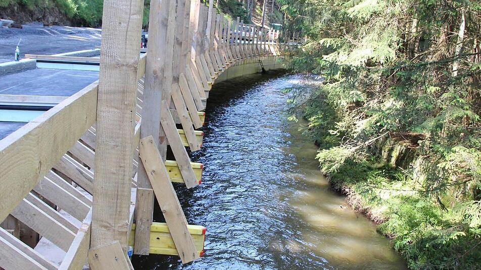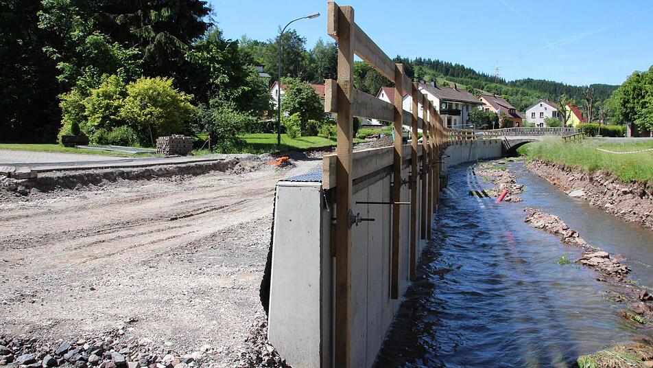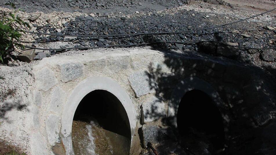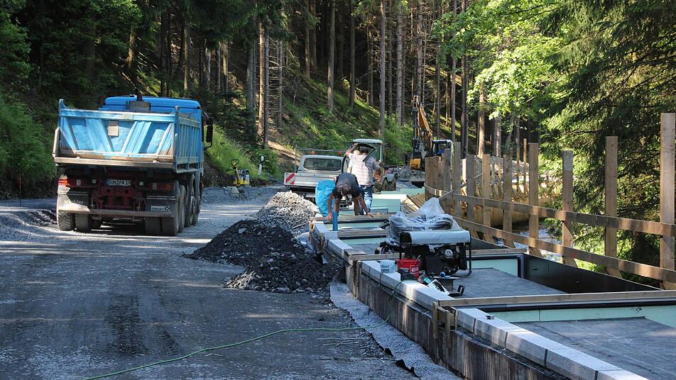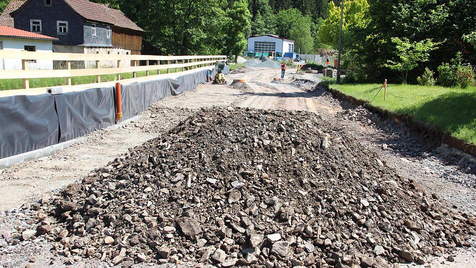 Im August wird schließlich mit der vierten Stützmauer begonnen: an der Fehnenschneidmühle. Das kann man nicht früher tun, denn die Baufahrzeuge, vor allem die Fünfachser mit Material, müssen auf die über drei Kilometer lange Baustelle fahren können, am besten von der Staatsstraße aus, über die steile Straße von Posseck her wäre das viel zu gefährlich gewesen. "Wir durften uns den Zugang zur Baustelle nicht verbauen. Wenn wir diese Stützmauer früher angefangen hätten, wären die Laster nicht mehr reingekommen", erläutert Lothar Dressel. Bei den Bauarbeiten an verschiedenen Stellen muss er auch noch beachten, dass für die Bewohner der Felsmühle immer eine Möglichkeit der Ausfahrt bestehen muss, entweder Richtung Gifting oder Richtung Fehnenschneidmühle. Denn es soll nicht so gehen wie am Ortsrand von Gifting.