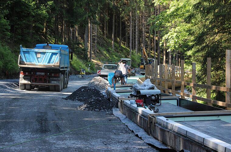Die neue Trassenführung von der Fehnenschneidmühle aus Richtung Gifting ist schon gut zu erkennen, die scharfe Kurve am Anfang wurde begradigt, im weiteren Verlauf wurden die Kurvenradien deutlich vergrößert. Die Straße wird breiter, in der Regel sechs Meter, in den Kurven sogar sechseinhalb Meter. Dort, wo einmal die Sprengschächte waren, entstand die erste der vier Stützmauern. Dazu musste der Kremnitzfluss über die angrenzende Wiese umgeleitet werden, ein neues Bachbett wurde gegraben. Bei den jüngsten Starkregen schwappte das Flusswasser über den künstlichen Damm und lief bis zur Stützmauer. Aber die war schon fertig betoniert und ausgeschalt. Kein Schaden also.