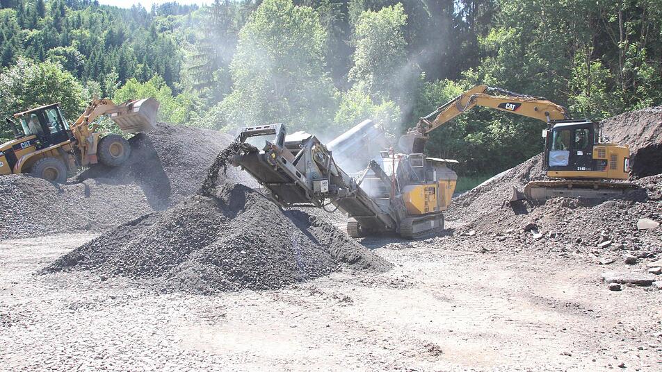 Zwischen der Felsnase und der Kremnitzbrücke wird das Fräsgut, das von der alten Teerdecke der Straße stammt, zerkleinert. Das alte, teerhaltige Material wird mit Zement vermischt und in der 20 Zentimeter starken hydraulischen Tragschicht eingebaut. Darauf folgen eine 14 Zentimeter starke Asphaltschicht und die vier Zentimeter dünne Deckschicht.