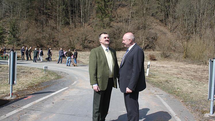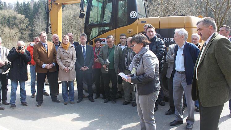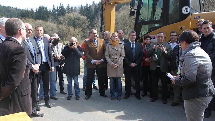 Obwohl die Straße nach der Grenzöffnung in einem desolaten Zustand gewesen sei, sei die Strecke zwischen Schauberg und Judenbach also trotzdem von vielen Verkehrsteilnehmern genutzt worden. Er erinnerte unter anderem an die Beauftragung für die Planung im Jahr 2000, an die Erteilung des Planfestfestellungsbeschlusses und an das von vielen Bürgern nicht mehr erwartete Signal des Thüringer Ministeriums für Bau, Landesentwicklung und Verkehr, endlich die Finanzmittel bereitzustellen. Er hofft, ebenso wie der Tettauer Bürgermeister Peter Ebertsch und sein Kollege aus Judenbach, Albrecht Morgenroth, dass bei der Vollendung der Straßenbaumaßnahme auf thüringischer Seite Ende 2016 auch der bayerische Teil dieser Straße, die sogenannte Staatsstraße, saniert ist. Denn dann soll zusammen mit dem Bayerischen Innenminister Joachim Herrmann die Einweihung gefeiert werden. Dessen Ministerium war es schließlich, das sich im vergangenen Jahr, auf Drängen von Vertretern aus Politik und Wirtschaft, bereit erklärte, den Ausbau der Straße in Angriff zu nehmen. Wenige Wochen später kam grünes Licht aus Thüringen.