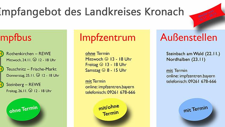 Darüber hinaus besteht auch weiterhin die Möglichkeit, sich ohne Termin im Kronacher Impfzentrum impfen zu lassen. Dies ist möglich jeweils mittwochs und freitags von 13 bis 18 Uhr und samstags von 8 bis 15 Uhr. Allerdings kann es aufgrund der hohen Nachfrage aktuell auch hier zu Wartezeiten kommen. Zudem kann für eine gewünschte Impfung im Impfzentrum auch ein Termin vorab vereinbart werden. Für eine Impfung in einer der Außenstellen (Neukenroth, Steinbach am Wald und Nordhalben) ist eine vorherige Anmeldung zwingend erforderlich.