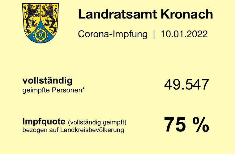 Die Impfquote der vollständig Geimpften (49.547) betrage im Landkreis Kronach folglich 74,7 Prozent.
