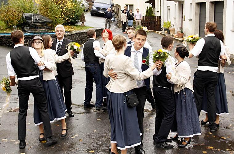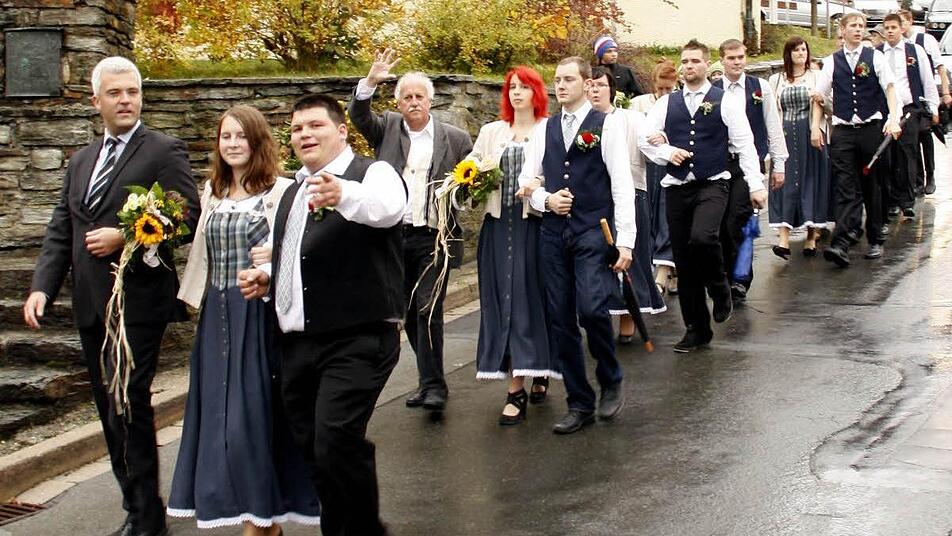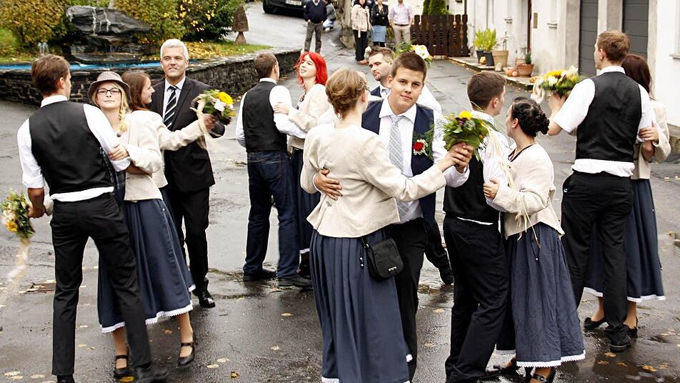 Mit dem Musikverein Lauenstein zogen dann alle im nördlichsten Landkreisdorf hinab zum "Anger", um dort noch einmal mit den Ehrengästen bei zahlreichen Besuchern, den Rheinländer, Walzer und die Polka in ihren Trachten mit den schönen Sträußen in den Händen zu tanzen.