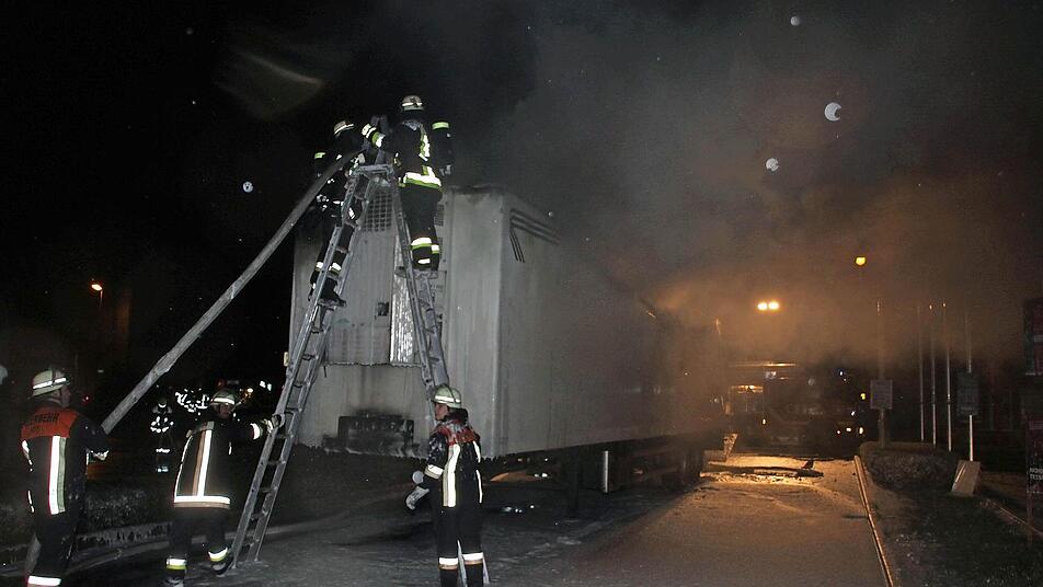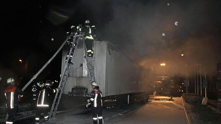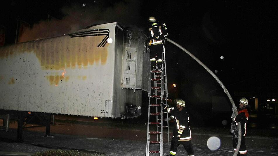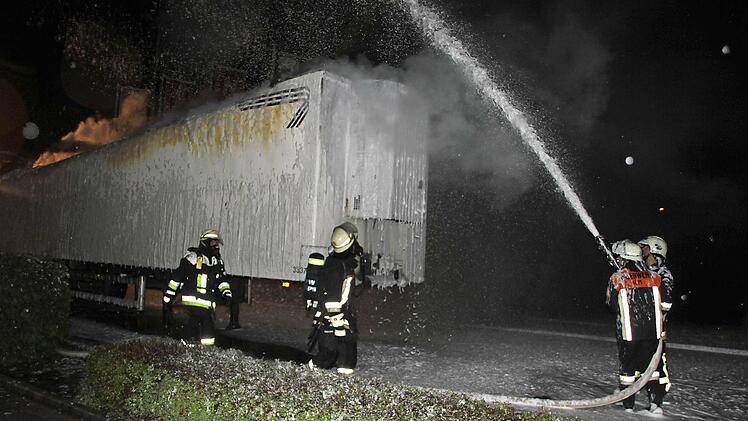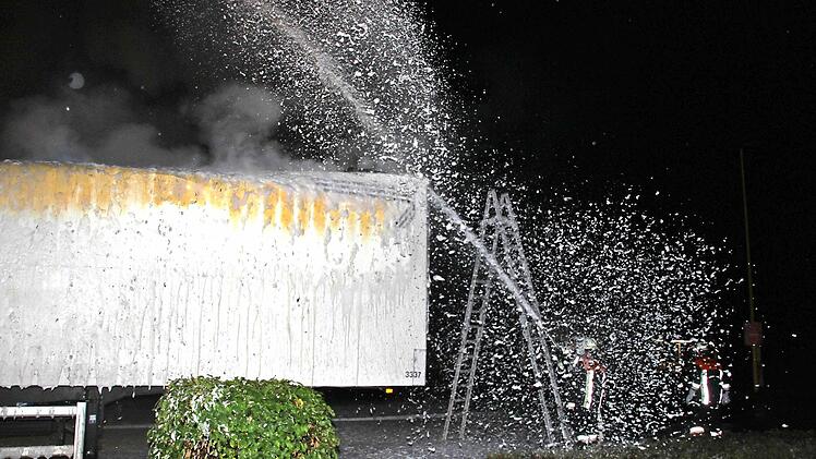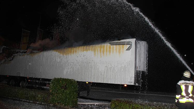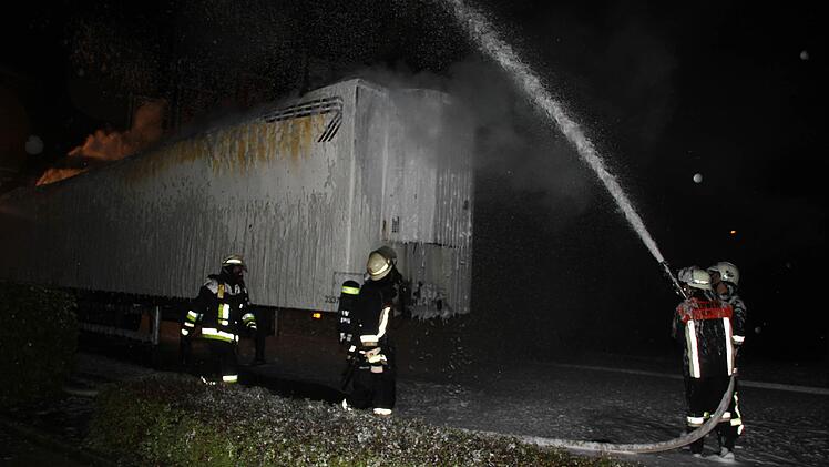 Immer wieder flackern Brandnester auf Inzwischen waren auch schon die Rettungskräfte alarmiert. Als die Feuerwehr Küps mit 30 Einsatzkräften nach wenigen Minuten eintraf, war der Auflieger bereits im Vollbrand. Mit Schaum gelang es den Wehrleuten, das Feuer einzudämmen. Auch nach mehr als einer Stunde - nach 3 Uhr - flackerten besonders im vorderen Bereich des Aufliegers immer wieder Flammen auf. Die Feuerwehr war mit schwerem Atemschutz im Einsatz. Das vorsorglich alarmierte Rote Kreuz brauchte nicht einzugreifen.