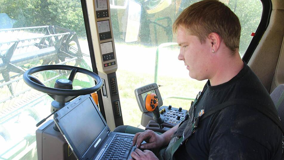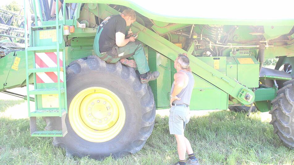 Doch das mit Elektronik voll gestopfte Teil zickt manchmal. Eine Warnlampe leuchtet auf, deutet an, dass etwas verstopft ist. Vorsichtshalber lässt Vonberg einen Monteur der Firma Kotschenreuther aus Neufang kommen. Das Weiterfahren und bedingt dadurch eventuell ein Ausfall der Erntemaschine dürfen nicht riskiert werden. Simon Böhner kommt mit dem Werkstattwagen zum Feld, checkt per Laptop alles und gibt Entwarnung. Die Störungsmeldung kommt zwar immer noch, aber Udo Vonberg kann weiterarbeiten. Das freut auch dessen Sohn Stefan. Der 13-Jährige sitzt auf dem zweiten Platz in der Kanzel, beherrscht das schwere Gefährt so gut wie der Vater, darf ab und zu mal die Knöpfe am Joystick bedienen.